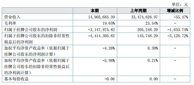 本期公司實(shí)現(xiàn)營(yíng)業(yè)收入1,490.57萬(wàn)元,較上年同期3,347.46萬(wàn)元下降55.47%,主要是因?yàn)?8年新年在2月份,17年新年在1月份,導(dǎo)致訂單貨期推遲了一個(gè)月左右,重要客戶的大部分產(chǎn)品主要在7月份開(kāi)始才陸續(xù)出貨,因此本期確認(rèn)的收入大幅下降;營(yíng)業(yè)成本1,197.61萬(wàn)元,較上年同期2,559.51萬(wàn)元下降53.21%,營(yíng)業(yè)成本的下降趨勢(shì)與銷(xiāo)售收入減少保持一致;毛利率19.65%較上年同期23.54%下降3.89%;本年虧損314.80萬(wàn)元,主要是因?yàn)樯习肽赇N(xiāo)售規(guī)模縮小,而部分成本費(fèi)用相對(duì)固定,公司盈利空間進(jìn)一步壓縮所致。?