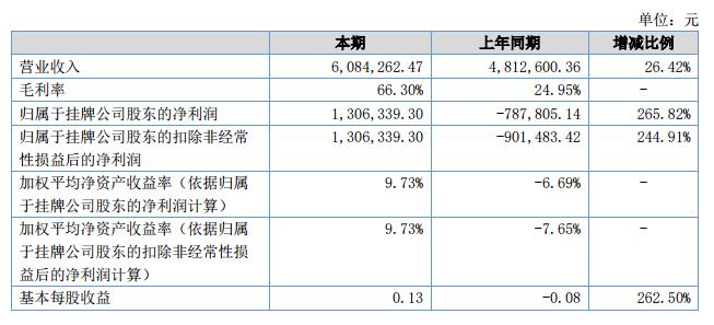 報告期內(nèi)公司營業(yè)總成本479.25萬元,比去年同期減少15.56%;公司實現(xiàn)凈利潤為130.63萬元,比去年同期增加209.41萬元、歸屬于掛牌公司股東的凈利潤增加265.82%、歸屬于掛牌公司股東的扣除非經(jīng)常性損益后的凈利潤增加265.98%、基本每股收益增加262.50%?。