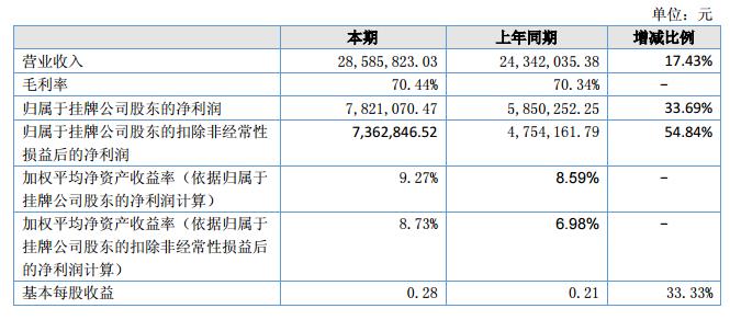 報告期內(nèi)公司實現(xiàn)營收收入28,585,823.03元,較去年同期增加銷售金額4,243,787.65元,增長率為17.43%,增長的主要原因為公司大力發(fā)展的反信息詐騙產(chǎn)品在上半年市場取得較好的成果。報告期內(nèi)歸屬于母公司所有者的凈利潤為7,821,070.47元,較去年同期增加1,970,818.22元,增長率為33.69%,;主要上半年中標多個省的反信息詐騙項目所致。?