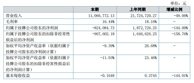 報告期內,公司實現(xiàn)營業(yè)收入11,066,772.13元,上年同期營業(yè)收入21,724,720.27元,較上年同期減少49.06%;報告期內,公司營業(yè)成本9,247,390.28元,上年同期營業(yè)成本17,779,915.35元,較上年同期減少47.99%;報告期內,公司凈利潤-824,084.73元,上年同期凈利潤1,872,726.25元,較上年同期減少144.00%,?