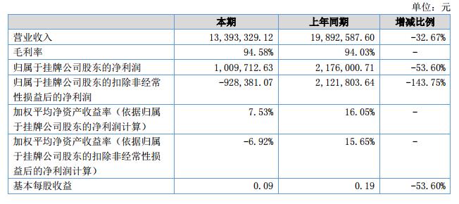 報告期內(nèi)公司營業(yè)收入為1,339.33萬元,較2017年同期下降649.93萬元,降幅32.67%,凈利潤為100.97萬元,較2017年同期減少116.63萬元,降幅53.60%。?