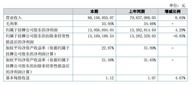 報告期內(nèi),公司經(jīng)營業(yè)績穩(wěn)定,公司實現(xiàn)營業(yè)收入8,015.70萬元,同比增長0.65%,利潤總額1,642.69萬元,同比增長3.39%,實現(xiàn)凈利潤1,395.67萬元,同比增長4.29%,經(jīng)營活動產(chǎn)生的現(xiàn)金流量凈額為1,652.29萬元,同比增長23.55%。?