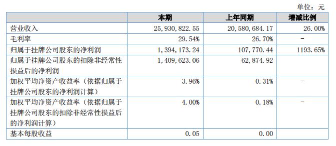 報告期內(nèi)公司實現(xiàn)營業(yè)收入25,930,822.55元,較去年同期增加535.01萬元,公司實現(xiàn)凈利潤1,394,173.24元,較去年同期增長了1193.65%。?