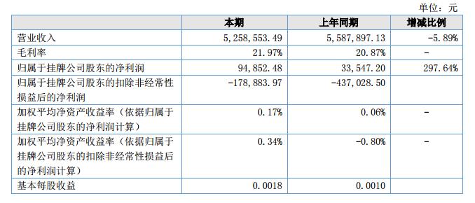 報(bào)告期內(nèi),公司實(shí)現(xiàn)營業(yè)收入525.86萬元,同比下降5.89%;營業(yè)成本410.30萬元,同比下降7.2%;毛利率21.97%,同比上升1.10%;凈利潤13.34萬元,同比上升297.64%。?