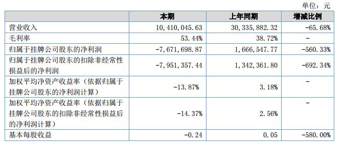 報告期內(nèi)公司實現(xiàn)營業(yè)收入10,410,045.63元,同比下降65.68%;報告期內(nèi)發(fā)生營業(yè)成本4,847,382.67元,同比下降73.92%;凈利潤-7,671,698.87,出現(xiàn)虧損。?