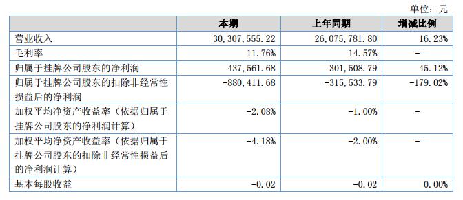 報告期內(nèi)公司實現(xiàn)營業(yè)總收入30,307,555.22元,較去年同期增長4,231,773.42元,同比增長16.23%;凈利潤-437,561.68元,虧損比上年同期上升45.12%。?