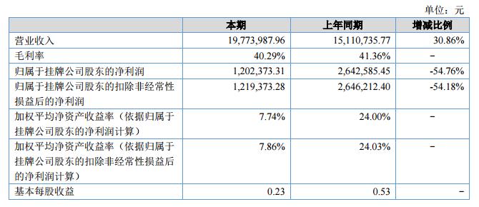 報告期內(nèi)實(shí)現(xiàn)營業(yè)收入19,773,987.96元,同比增長30.83%,凈利潤1,202,373.313元,同比下降-54.50%,總資產(chǎn)25,059,815.84元,同比增長11.81%,凈資產(chǎn)15,495,774.25元,同比增長8.05%,?