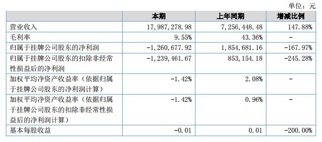 報告期內,公司實現(xiàn)營業(yè)收入17,987,278.98元,比去年同期7,256,448.48元增長147.88%;公司凈利潤為-1,260,677.92元,扣除非經(jīng)常性損益的凈利潤-1,239,461.67元,相比去年同期由盈轉虧。?