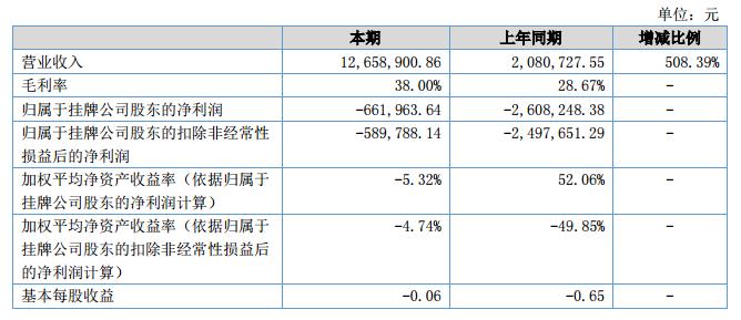 2018年半年度,實現(xiàn)營業(yè)收入12,658,900.86元,較上年同期增長508.39%,主要系公司抓住市場機遇,通過多年的運營積累的客戶資源和技術(shù)實力,合同簽約量增長較快;同時帶來凈利潤水平的逐漸提高。2018年6月末資產(chǎn)總額為27,721,319.38元,較上年末增長13.00%,變動不大;負債總額為15,382,952.30元,較上年末增長30.82%,主要系營業(yè)收入規(guī)模的增長帶來應付賬款余額的增加;2018年6月末所有者權(quán)益余額為12,338,367.08元,較上年末下降3.41%,變動不大;2018年6月末應收賬款余額為12,777,200.71元,較上年末增長64.24%,主要系營業(yè)收入規(guī)模的增長。?