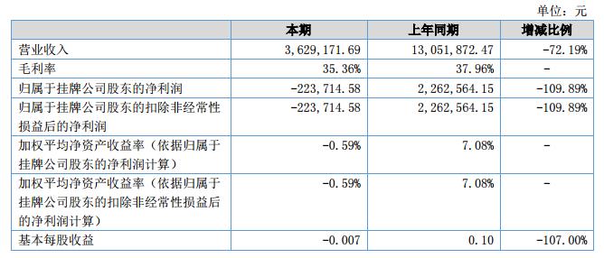 報(bào)告期內(nèi)公司實(shí)現(xiàn)營業(yè)收入362.92萬元,同比下降了72.19%;凈利潤-22.37萬元,同比下降了109.89%。?