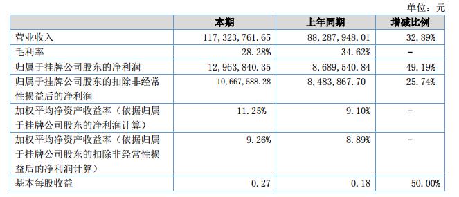 報告期內(nèi),公司實現(xiàn)營業(yè)收入11732萬元,同比增長33%;實現(xiàn)歸屬于掛牌公司股東的凈利潤1296萬元,同比增長49%。報告期末,公司資產(chǎn)總額21440萬元,負債總額9606萬元,歸屬于掛牌公司股東的所有者權(quán)益總額為11834萬元。?