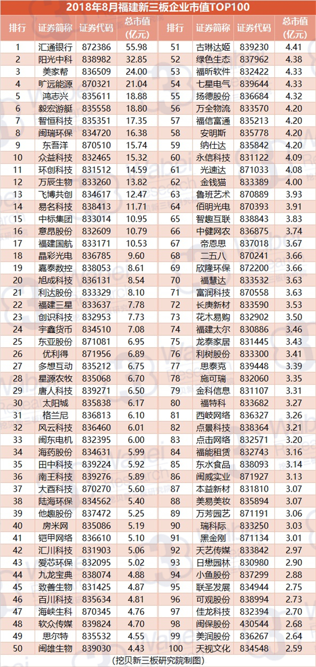 附:2018年8月福建新三板企業(yè)市值TOP100