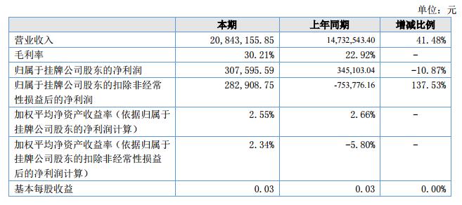 截止報告期末,公司資產(chǎn)總額25,551,655.73元,較期初25,164,960.99元增長了1.54%;負(fù)債13,325,155.17元,較期初13,246,056.02元增長了0.60%;凈資產(chǎn)12,226,500.56元,較期初11,918,904.97元增加了2.58%;報告期內(nèi)公司銷售收入20,843,155.85元,較去年同期14,732,543.40元增長了41.48%;營業(yè)成本14,547,127.20元,較去年同期11,356,288.16元增加了28.10%;本期毛利率為30.21%,較去年同期22.92%增長31.81%;凈利潤307,595.59元,較去年同期345,103.04元減少了10.87%,;經(jīng)營活動產(chǎn)生的現(xiàn)金流量凈額2,754,058.61元,轉(zhuǎn)去年同期1,153,346.88元增長了138.79%。?