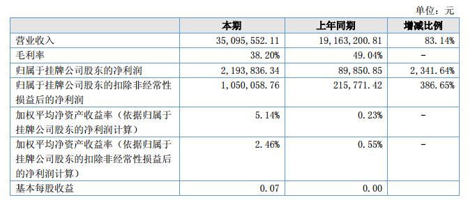 2018年上半年營業(yè)收入目標(biāo)3000萬元,由于擴大了經(jīng)營范圍,增強了宣傳力度,實際完成35,095,552.11元,完成計劃的117%,營業(yè)收入比上期實現(xiàn)大幅增長;2018年上半年實現(xiàn)凈利潤219萬元,凈利潤比上期增長2,341.64%;報告期內(nèi)總資產(chǎn)110,794,783.58元,去年同期總資產(chǎn)106,581,860.19元,較去年增長3.95%。?