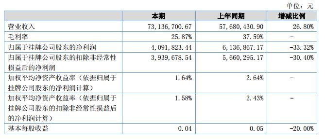 報告期內(nèi),公司實現(xiàn)營業(yè)收入7,313.67萬元,與去年同期同比增長26.80%;營業(yè)成本5421.64萬元,較上年同期增長50.61%;稅金及附加72.03萬元,上年為-52.33萬元;公司實現(xiàn)凈利潤409.18萬元,同比減少33.32%。