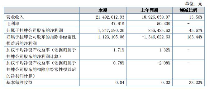 報告期內(nèi)公司實現(xiàn)營業(yè)收入21,492,012.93元,較上年同期增加13.56%,主要是公司繼續(xù)加大市場推廣和開拓所致;營業(yè)成本11,259,401.85元,較上年同期增加19.71%,主要是原輔料材價格上漲,人工成本增加所致;報告期內(nèi)實現(xiàn)利潤總額1,340,495.01元、凈利潤1,247,590.36元,較上年同期分別增加28.63%、45.67%,主要是加大市場開拓和優(yōu)化公司管理所致。?