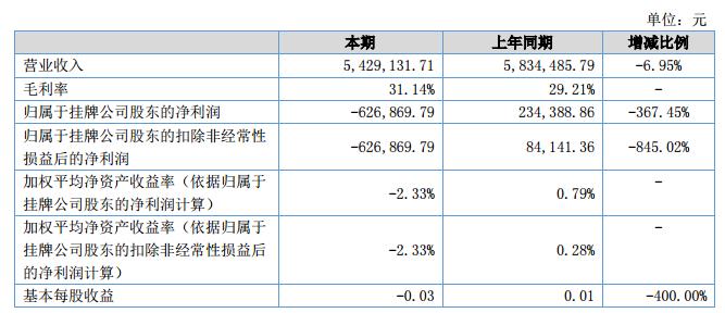 報告期內(nèi)公司主營業(yè)務(wù)收入構(gòu)成穩(wěn)定,未發(fā)生重大變動,主營業(yè)務(wù)收入542.91萬元,同比降幅6.95%;實現(xiàn)凈利潤-62.69萬元,比去年同期降幅-367.45%。?