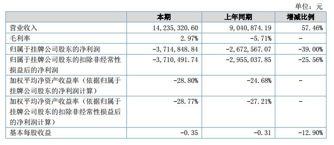 報(bào)告期內(nèi),公司實(shí)現(xiàn)營業(yè)收入14,235,320.60元,營業(yè)利潤和凈利潤分別為-4,274,128.24元、-3,714,848.84元,截止2018年6月30日,公司總資產(chǎn)為18,756,313.36元,凈資產(chǎn)為11,040,238.10元。?