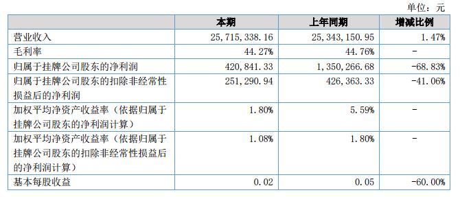 報(bào)告期內(nèi),公司實(shí)現(xiàn)營(yíng)業(yè)收入2,571.53萬(wàn)元,營(yíng)業(yè)成本1,433.14萬(wàn)元,凈利潤(rùn)為42.08萬(wàn)元,公司資產(chǎn)總額5,077.03萬(wàn)元,凈資產(chǎn)2,363.58萬(wàn)元,負(fù)債總額2,713.45萬(wàn)元,,經(jīng)營(yíng)活動(dòng)產(chǎn)生的現(xiàn)金流量?jī)纛~-5.27萬(wàn)元,投資活動(dòng)產(chǎn)生的現(xiàn)金流量?jī)纛~79.95萬(wàn)元,籌資活動(dòng)產(chǎn)生的現(xiàn)金流量?jī)纛~-58.76萬(wàn)元。?