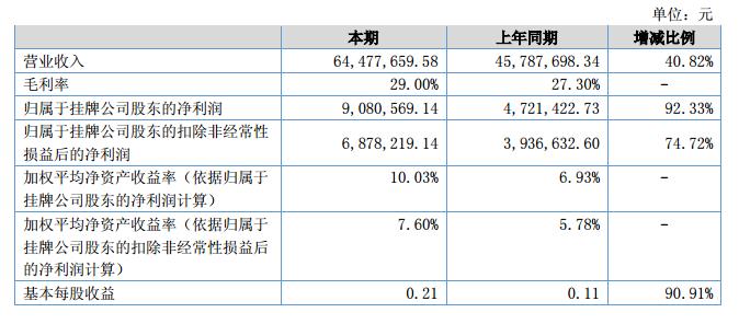 報(bào)告期內(nèi)公司實(shí)現(xiàn)營(yíng)業(yè)收入6,447.77萬(wàn)元,較上年同期4,578.77萬(wàn)元有所上升,上漲幅度為40.82%;營(yíng)業(yè)成本4,577.68萬(wàn)元,較上年同期3,328.65萬(wàn)元上升37.52%;鑒于營(yíng)業(yè)收入上升幅度超過(guò)營(yíng)業(yè)成本的上升幅度,毛利率由2017年1-6月的27.30%上漲至2018年1-6月的29.00%,毛利率上漲主要因?yàn)楣静粩嗟丶哟笱邪l(fā)投入,推出新產(chǎn)品,提高公司服務(wù)質(zhì)量和行業(yè)的競(jìng)爭(zhēng)力,降低公司的營(yíng)業(yè)成本,從而使得綜合毛利率上升。2018年上半年實(shí)現(xiàn)凈利潤(rùn)908.06萬(wàn)元,較上年同期472.14萬(wàn)元上升92.33%,2018年1-6月總費(fèi)用占營(yíng)業(yè)收入88.51%,與去年同期占比稍微下降。2?