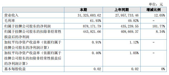 報告期內(nèi),公司實現(xiàn)營業(yè)收入31,325,603.62元,較上年同期增長3,367,870.16元,增長比率為12.05%;凈利潤為878,171.79元,較上年同期增加442,932.24元,較上年同期增長101.77%。?