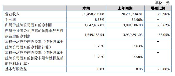 公司實(shí)現(xiàn)營業(yè)收入99,458,706.68元,較上年同期增加389.96%;營業(yè)成本90,930,000.00元,較上年同期增加588.08%,本期歸屬于掛牌公司股東的凈利潤1,647,452.01元,較上年同期減少58.62%。報(bào)告期內(nèi)公司營業(yè)收入大幅增加的主要原因是完成大額銷售合同;營業(yè)成本大幅增加主要原因是營業(yè)收入增長導(dǎo)致營業(yè)成本增加。凈利潤減少原因?yàn)楸灸瓿杀菊急容^高。?