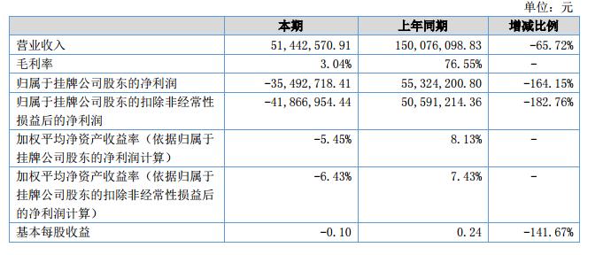 報告期內(nèi)公司實現(xiàn)營業(yè)收入5,144.26萬元,較上年同期15,007.61萬元下降9,863.35萬元;歸屬于母公司的凈利潤為-3,549.27萬元,較上年同期5,532.42萬元下降9,081.69萬元。