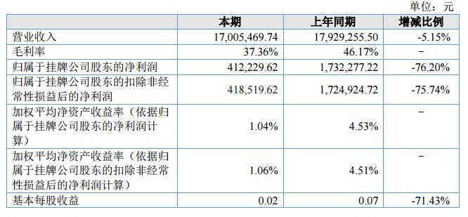 報(bào)告期內(nèi),公司實(shí)現(xiàn)營(yíng)業(yè)收入為17,005,469.74元,較上期同比下降5.15%;實(shí)現(xiàn)凈利潤(rùn)為412,229.62元,較上期同比下降76.20%;截止報(bào)告期末,公司賬面總資產(chǎn)為73,278,385.62元,歸屬于掛牌公司股東的凈資產(chǎn)為39,822,401.67元。?