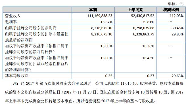 報(bào)告期內(nèi),公司實(shí)現(xiàn)營業(yè)收入11,116.98萬元,較上年同期增長112.03%;本期公司實(shí)現(xiàn)凈利潤821.67萬元,較上年同期上升30.45%;本期毛利率為15.87%,?