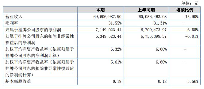報告期內,公司實現(xiàn)營業(yè)收入69,606,987.90元,比去年同期增長15.9%,實現(xiàn)歸屬于掛牌公司股東的凈利潤7,149,023.44元。?