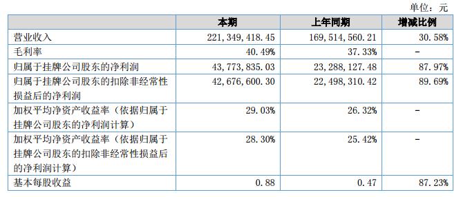 報(bào)告期內(nèi),公司實(shí)現(xiàn)銷售收入221,349,418.45元,上年同期為169,514,560.21元,增長(zhǎng)30.58%;報(bào)告期內(nèi),公司實(shí)現(xiàn)凈利潤43,773,835.03元,上年同期為23,288,127.48,增長(zhǎng)87.97%?。