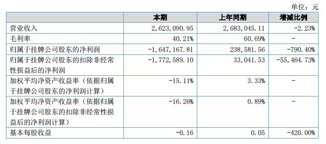 報告期內(nèi)公司營業(yè)收入2,623,090.95元,上年同期2,683,045.11元,下降2.23%;營業(yè)成本1,568,438.29元,上年同期1,054,633.88元,上升48.71%;凈利潤-1,647,167.81元,上年同期238,581.56元,下降790.40%;?