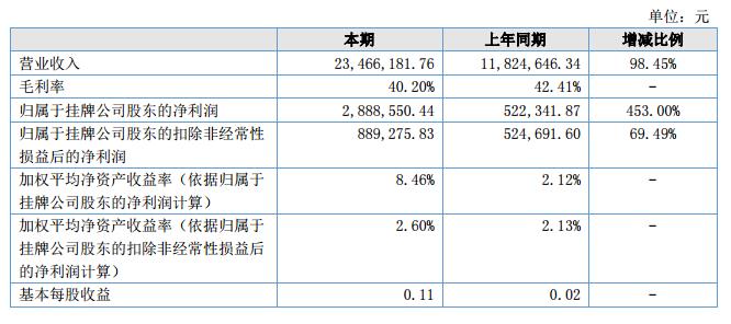 報告期內(nèi)公司營業(yè)收入23,466,181.76元,相比上年同期11,824,646.34元,同比增長了98.45%,主要原因是公司在2017年初拓展的城鄉(xiāng)生活污水綜合治理項目經(jīng)過一年的孵化后在2018年初形成了合同及收入。2018年上半年度營業(yè)成本14,032,297.27元,成本率為59.80%,同比上漲了2.21%。2018年上半年度凈利潤為2,888,550.44元,相比上年同期522,341.87元,同比增長了453.00%。?