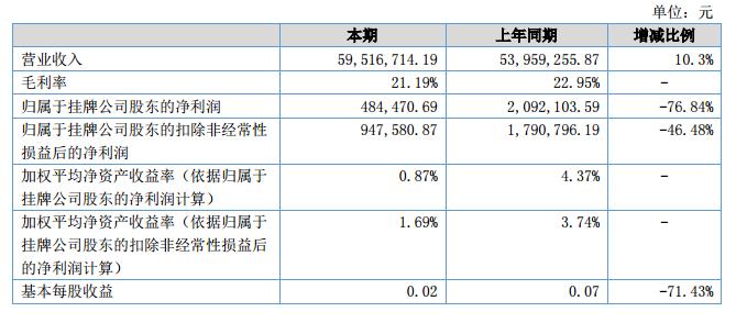 報告期內(nèi),公司實(shí)現(xiàn)營業(yè)收入59,516,714.19元,較上年度同期增長9.34%。凈利潤484,470.69元,同比下降76.84%,主要原因在于2018年上半年有632,000.00元的對外捐贈,另外毛利率同比上年復(fù)同期下降了1.76%。?