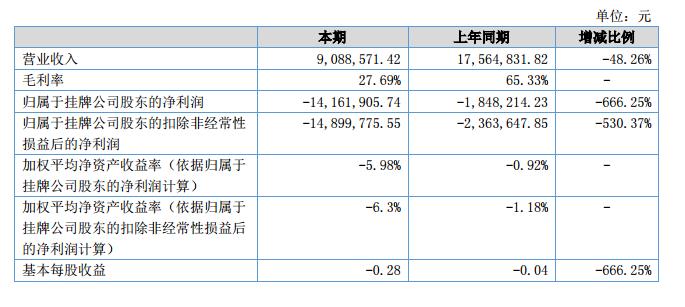 報告期內(nèi),公司的營業(yè)收入908.86萬元,同比下降48.26%;凈利潤-1,416.19萬元,同比下降666.25%。?