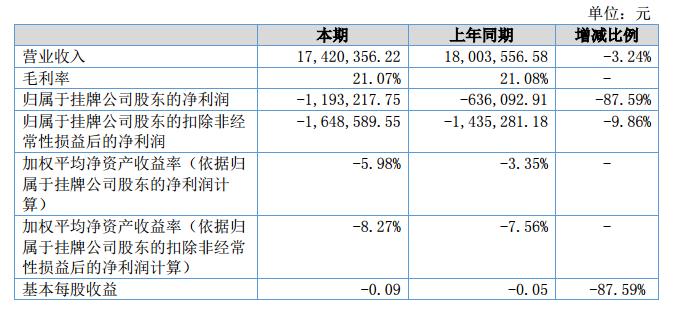 報(bào)告期內(nèi),公司實(shí)現(xiàn)營(yíng)業(yè)收入1,742.04萬(wàn)元,較上年同期1,800.35萬(wàn)元減少3.24%;其中主營(yíng)業(yè)務(wù)較上年同期減少52.92萬(wàn)元,同比下降2.98%(機(jī)器人及系統(tǒng)集成收入同比下降2.15%,自動(dòng)化元器件分銷業(yè)務(wù)收入同比下降4.48%)。凈利潤(rùn)為-119.32萬(wàn)元,較上年同期-63.60萬(wàn)元降低87.59%。?