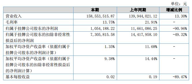 挖貝網(wǎng)9月12日,宜美科技(證券代碼:836941)近日公布的2018年半年報(bào)顯示,截至2018年6月30日,企業(yè)實(shí)現(xiàn)營收1.59億元;歸屬于掛牌公司股東的凈利潤為105.41萬元。