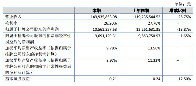 報告期內(nèi),公司實現(xiàn)營業(yè)收入149,935,853.98元,較上年同期增加25.75%,主要原因是國外市場開拓成效大業(yè)績上升;實現(xiàn)歸屬掛牌公司所有者凈利潤10,561,357.63元;公司總資產(chǎn)228,185,226.03元,較上年同期增加0.45%;歸屬掛牌公司所有者權(quán)益86,744,296.01元,較上年同期減少15.54%;經(jīng)營活動產(chǎn)生的現(xiàn)金流量凈額-946,981.73元。?