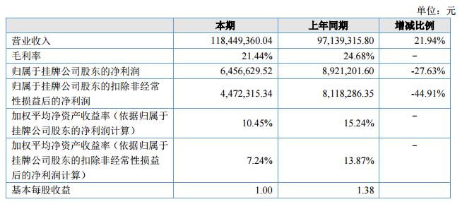 報告期內(nèi)公司實(shí)現(xiàn)營業(yè)收入118,449,360.04元,較上年同期增加21.94%,主要原因是公司品質(zhì)穩(wěn)定,客戶市場份額持續(xù)擴(kuò)大原因;凈利潤6,114,069.32元,較上年同期8,430,805.42元,利潤率下降27.48%?