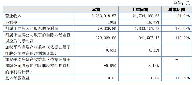 報告期內(nèi),公司實(shí)現(xiàn)營業(yè)收入3,283,018.87元,較上年同期21,794,468.63元下降18,511,449.76元,下降比例84.94%,主要系:公司處于主營業(yè)務(wù)轉(zhuǎn)型階段,新產(chǎn)品還處于初步投產(chǎn)中,經(jīng)營規(guī)模尚未正式體現(xiàn)。?