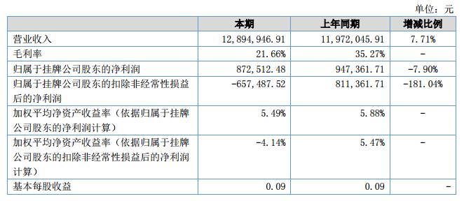 報(bào)告期內(nèi),公司實(shí)現(xiàn)營(yíng)業(yè)收入為1,289.49萬(wàn)元,較上年同期1,197.20萬(wàn)元增長(zhǎng)7.71%,營(yíng)業(yè)成本為1,010.23萬(wàn)元,較上年同期774.99萬(wàn)元增長(zhǎng)30.35%。歸屬于掛牌公司的凈利潤(rùn)為87.25萬(wàn)元,較上年同期94.74萬(wàn)元下降7.90%。主要原因?yàn)楸酒诙嗑Ч鑱?lái)料加工銷(xiāo)量為929.68噸,自營(yíng)多晶硅銷(xiāo)量為118.09噸,上年同期多晶硅來(lái)料加工銷(xiāo)量為1383.18噸,自營(yíng)多晶硅銷(xiāo)量為59.02噸,營(yíng)業(yè)成本構(gòu)成中多晶硅材料增加所致。?