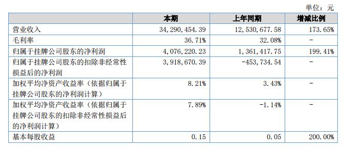 報(bào)告期內(nèi)主營(yíng)業(yè)務(wù)收入3,429.05萬元,較上年同期1,253.07萬元增長(zhǎng)173.65%,增長(zhǎng)幅度較大;歸屬于母公司所有者的凈利潤(rùn)407.62萬元,較上年同期136.14萬元增長(zhǎng)199.41%。?