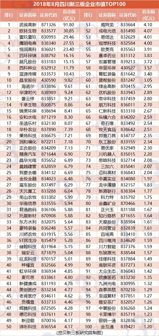 附:2018年8月四川新三板企業(yè)市值TOP100