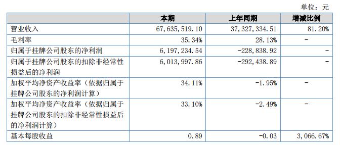 本期公司營業(yè)收入67,635,519.10元,上年同期為37,327,334.51元,同比增加81.20%;公司本期凈利潤6,197,234.54元,上年同期為-228,838.92元,,主要原因是本期業(yè)務(wù)量增加,銷售毛利大幅增長導(dǎo)致。?