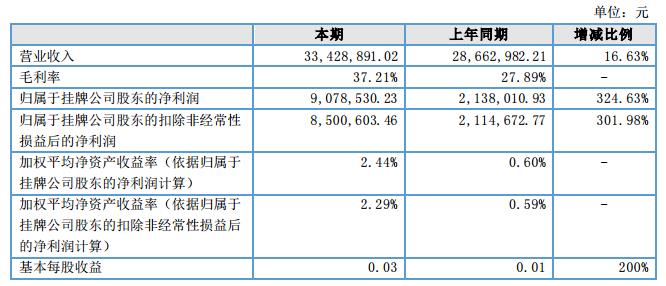 報(bào)告期內(nèi),公司營業(yè)收入3,342.89萬元,同比上升16.63%;實(shí)現(xiàn)歸屬于掛牌公司股東的凈利潤907.85萬元,同比大幅上升324.63%。?