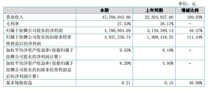 報(bào)告期公司實(shí)現(xiàn)營業(yè)收入4,770.99萬元,較上年同期增長109.03%;實(shí)現(xiàn)歸屬于掛牌公司股東的凈利潤為470.10萬元,較上年同期增長49.27?%。