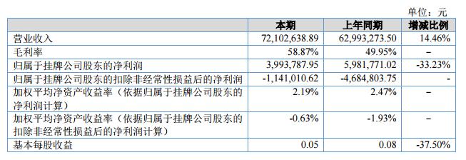 報告期內(nèi),公司實現(xiàn)營業(yè)收入7,210.26萬元,較上年同期增長14.46%;公司實現(xiàn)歸屬于母公司的凈利潤399.38萬元,較上年同期減少33.23%。?