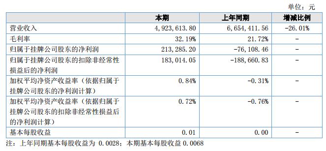 報(bào)告期內(nèi),公司實(shí)現(xiàn)營業(yè)收入4,923,613.80元,較上期減少了26.01%,從報(bào)告期內(nèi)經(jīng)營情況來看,公司主要客戶未發(fā)生大變化,產(chǎn)品毛利率由21.72%增長至32.19%發(fā)生明顯變化。?