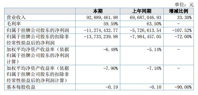 報(bào)告期內(nèi)公司實(shí)現(xiàn)營(yíng)業(yè)收入92,889,461.98元,較上年同期增長(zhǎng)33.30%;公司營(yíng)業(yè)收入以軟件銷售類收入為主,報(bào)告期各期均在55%-60%之間;軟件服務(wù)類收入占比穩(wěn)定在20%-30%之間;凈利潤(rùn)-12,246,233.61元,歸屬于掛牌公司股東-11,274,432.77元,經(jīng)營(yíng)活動(dòng)產(chǎn)生的現(xiàn)金凈額為-39,733,015.55元。?