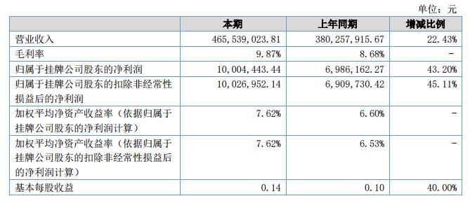 報(bào)告期內(nèi)公司實(shí)現(xiàn)營業(yè)收入465,539,023.81元,較同期增長22.43%,報(bào)告期內(nèi)公司實(shí)現(xiàn)凈利潤10,004,443.44元,較同期增長43.20%。?